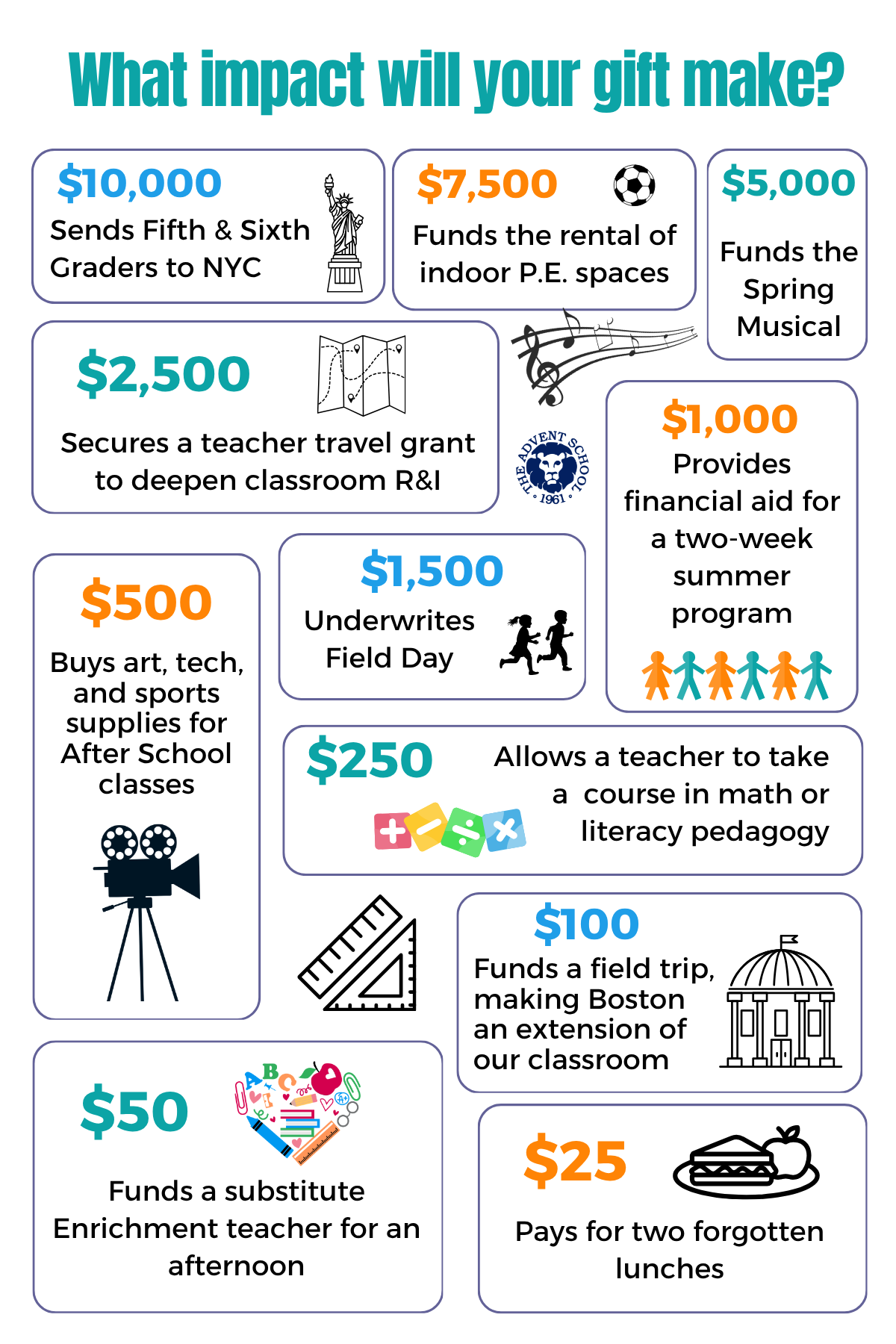 The Advent Fund is a collective gift from the extended community to fill an intentional $4,500 gap per student in the annual operating budget. Dollars donated to the Advent Fund are immediately put to work to fortify our students’ educational, physical, emotional, and social needs and to provide expanded opportunities that enhance our academic programs and enrichment activities.